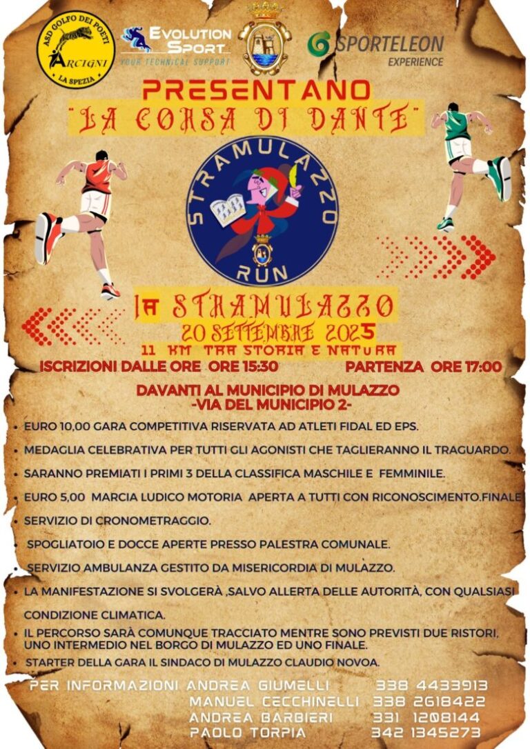 Mulazzo ( MS). Mattia Vasoli del Gruppo Podistico Parco Apuane e Sara Chiocca del Corrilunigiana hanno vinto alla maniera forte la prima edizione della Stramulazzo, “la Corsa di Dante” corsa podistica riservata ad atleti agonisti ed estesa anche ai marciatori.