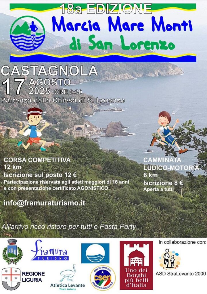 Ciao a tutti amici Arcigni!La gara alla quale abbiamo partecipato: io, Paolo Torpia, Luciano Bellavigna, Manuel Cecchinelli, Andrea Benacci e Giuseppe Pertosa, naturalmente come Arcigni, e’ la Marcia Mare Monti, di Castagnola di Framura, una gara tanto bella panoramicamente parlando, quanto dura a livello fisico, e resa ancora piu’ dura da un caldo che si e’ fatto sentire, sopratutto negli ultimi km esposti al sole, in quanto gran parte della gara si svolgeva in un tracciato sterrato ai piedi del Monte Serro ad anello per un totale di 12Km da dove si poteva intravedere il Mar Ligure che bagna le Cinque Terre, a fine gara grandissimo buffet con focaccia tradizionale ligure e pasta party finale, e colgo l’occasione per fare i complimenti agli organizzatori per la riuscita della gara. Un saluto a tutti. Andrea Giumelli.