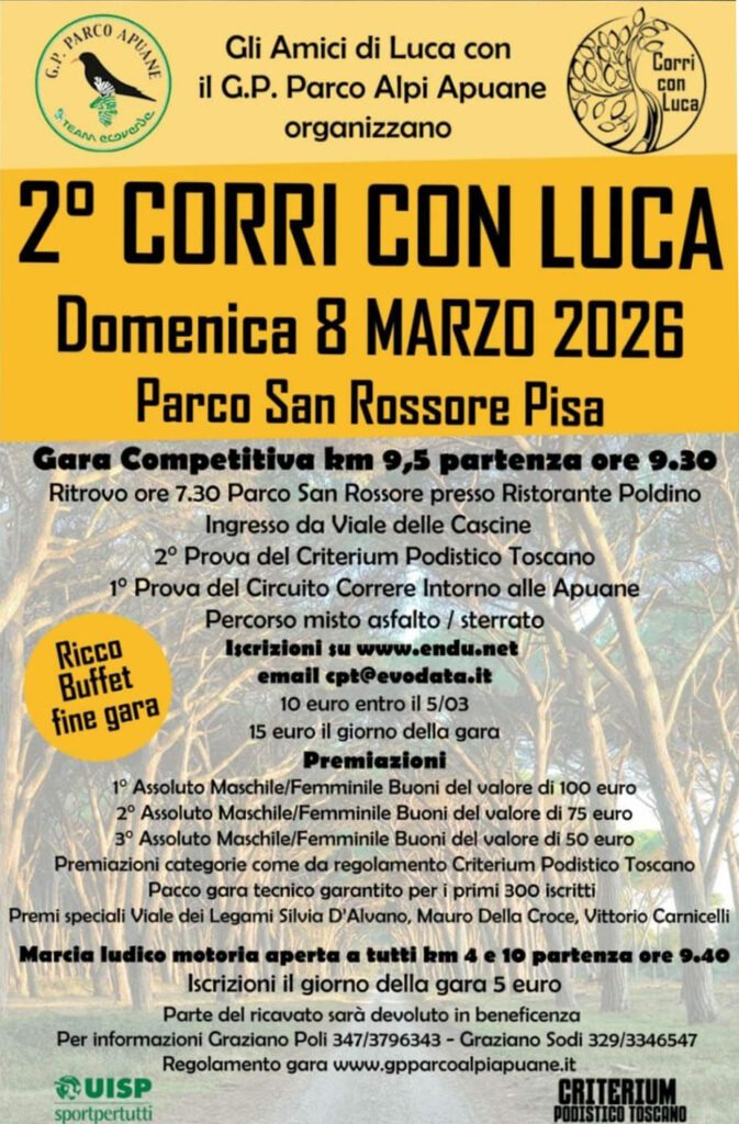 Ciao a tutti amici Arcigni!La gara della quale Vi racconto: e’ la Seconda Edizione della Corri con Luca; gara svoltasi nella splendida Tenuta di San Rossore, alle porte di Pisa; tanti atleti presenti da tutta la Toscana e non, e anche gli Arcigni non potevano mancare: oltre a me, presenti anche Riccardo Romano e Manuel Cecchinelli; partenza della gara, alle 9.30, come scritto prima dalla Tenuta di San Rossore, in un circuito di 9,5Km, di cui circa 2km in terreno sconnesso, nel complesso gara veloce e piacevole, molto ben organizzata sotto la visione del Patron del GP Parco Apuane: Graziano Poli, con un ricchissimo ristoro finale, una gara assolutamente da rifare. Un saluto a tutti da Andrea Giumelli.
