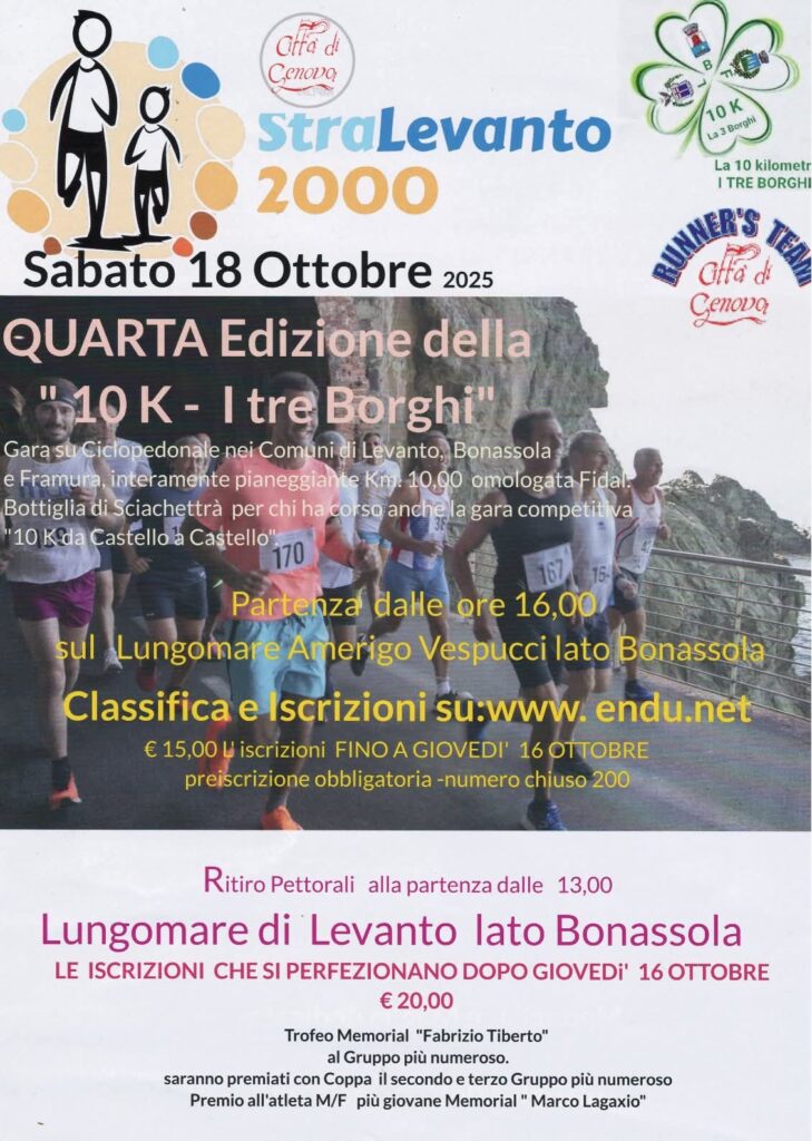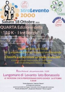 Nella velocissima 10 Km dei Tre Borghi ( Levanto , Bonassola e Framura) l’Asd Golfo dei Poeti ha conquistato successi importanti dimostrando grande competitività e compattezza. La squadra del Presidente Andrea Giumelli e del Segretario Riccardo Romano ( in veste di accompagnatore ufficiale) si è tolta non poche soddisfazioni.
