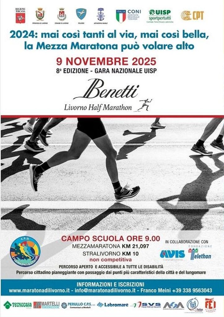 Ciao a tutti Amici Arcigni, la gara della quale voglio parlarvi e’:  l’8′ edizione della Benetti Livorno Half Marathon, coordinata magistralmente dal Sig. Franco Meini, una vera istituzione del podismo, nella citta’ labronica, che ha visto in questa edizione oltre 1100 atleti partecipanti, tra le quali ben 5 Arcigni, io, Manuel Cecchinelli, Giuseppe Pertosa, Mirko Boracchia, e la neo Arcigna: Lenuta Mandache, alle seconda gara in maglia giallonera, e alla prima Mezza Maratona in assoluto. Come scritto prima, oltre 1100 partecipanti alla partenza ore 9 presso il Campo Scuola via dei Pensieri, a pochi metri dallo Stadio Comunale Armando Picchi, la manifestazione si inoltrava tra le strade della citta’ toscana, fino a raggiungere Piazza della Repubblica, al passaggio dei 4 Mori, poi al 5Km  si tocca finalmente il mare, passando al Cantiere Benetti, main sponsor della manifestazione, all’uscita si prende si prende il caratteristico Lungomare della Bellana, costeggiando la famosissima: Terrazza Mascagni, e al 9 Km si fa il passaggio dentro l’Accademia Navale di Livorno, per l’occasione aperta a tutti i partecipanti, dopodiche’ lungo rettilineo fino al 18 km, costeggiando sempre il mare, sfiorando la Statua del Marinaio, e poi tornare al punto di partenza, che ha visto delle ottime prestazioni da parte di tutti gli Arcigni, complimenti sopratutto a Giuseppe  che ha chiuso in 1h e 37min la Mezza labronica, e a Lenuta che ha dimostrato un coraggio notevole a cimentarsi dopo cosi breve tempo alla Mezza Maratona. Bellissima gara come sempre, faccio i miei complimenti allo staff organizzativo capitanato egregiamente da Franco Meini, aspettiamo con ansia la Livorno Half Marathon 2026. Ciao a tutti da Andrea Giumelli.